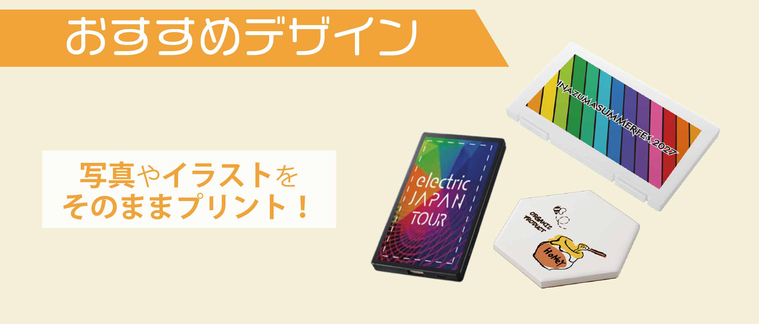 プラスチック製品からアクリル、金属、ガラス、木、革などにフルカラー印刷可能。版不要につき小ロット(1個から)での製作も可能。白インクと透明インク搭載。